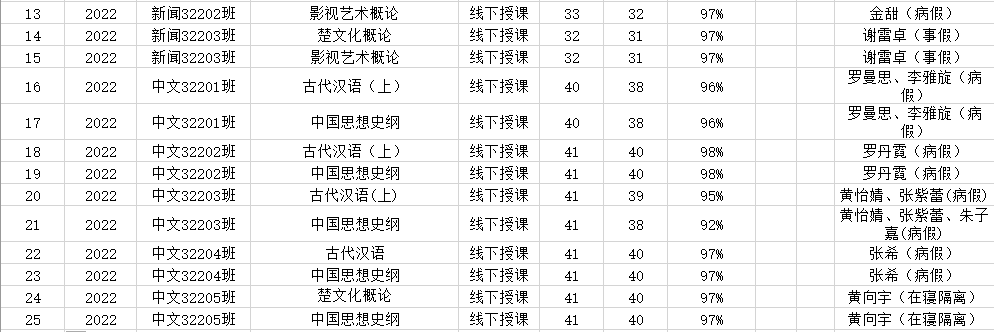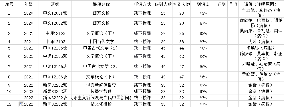 5月23日,我院组织学生干部对20、21、22级26个班的20门课程进行了51次课堂考勤,100%到课率26次,现将考勤结果公布如下: