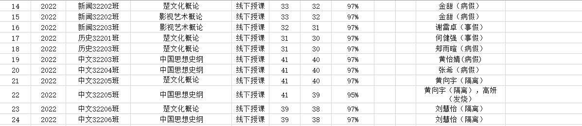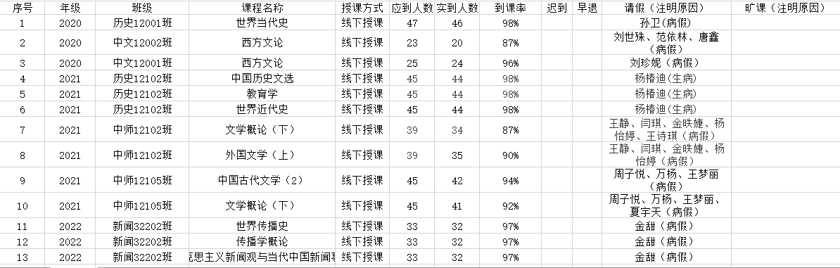 5月30日,我院组织学生干部对20、21、22级26个班的19门课程进行了48次课堂考勤,100%到课率24次,现将考勤结果公布如下:
