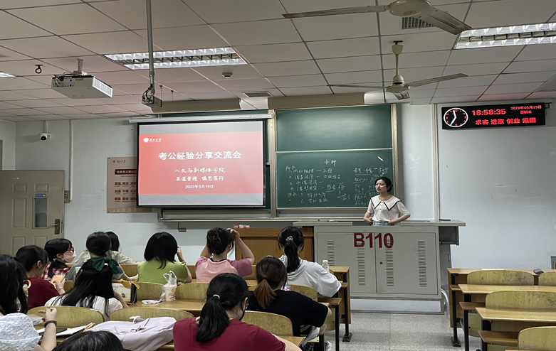 2023年5月19日晚19:00,伟德国际victor·1946源自考公经验分享交流会于13教B110教室成功召开,本次分享会由辅导员田华蓉老师主持,邀请2019级毕业生宋梦晗、张雨晴、盛苗三位同学分享自己在考公方面的经验,学院21级、22级部分意向考公的同学参会。