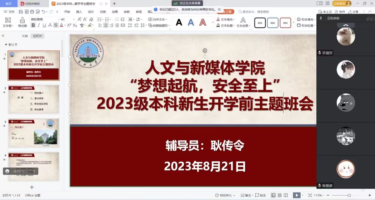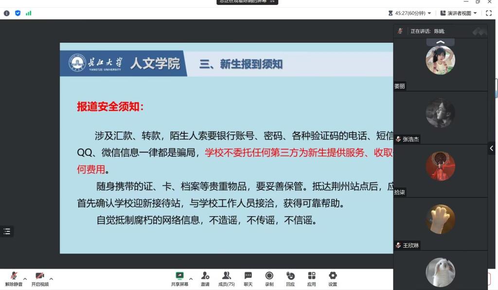 班会强调了开学时间和返校注意事项,提醒同学们注意返校安全,在人员密集场所佩戴好口罩,通过案例教学、安全提示等开展了生命安全教育、防溺水、防诈骗和心理健康教育,提高学生安全防范意识和自我保护能力。针对2023年2023级本科新生以及研究生新生,详细介绍了线上注册和线下报到的相关注意事项,在交流互动环节为同学们答疑解惑。