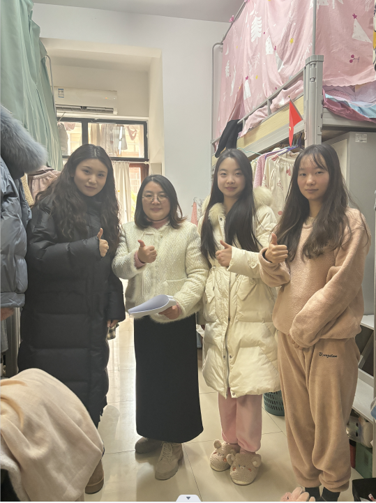 本次检查主要围绕学生宿舍内是否存在私拉乱接电源,储藏使用大功率违规电器、明火设备、易燃、易爆、强腐蚀性违禁物品和带电瓶车及电池进入宿舍充电等安全隐患。检查过程中,大部分宿舍的整体情况良好,地面无杂物堆积,房间干净整洁,物品摆放有序,学习氛围浓厚,室友关系融洽,展现了良好的精神面貌。对于发现的私拉电线问题,立即督促整改,同时对各宿舍同学进行冬季安全用电宣传教育。最后,陈娟老师提醒同学们要注意劳逸结合,关注身心健康,增强自我防范意识。