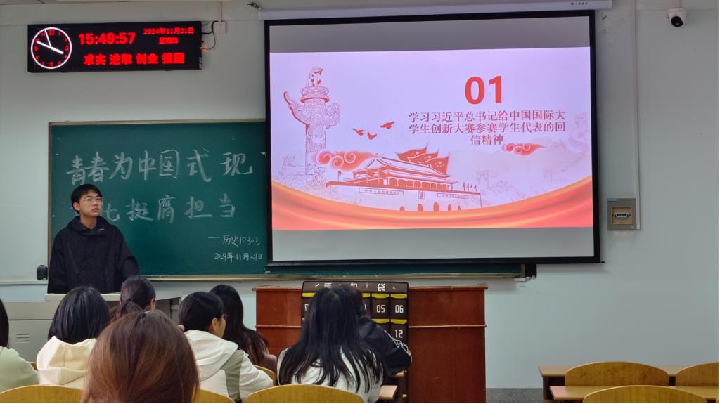 同学们开展学习,学习习近平总书记给中国国际大学生创新大赛参赛学生代表的回信精神,鼓励团员们将所学知识应用于实践,通过解决实际问题来提升自己的能力和才干。在活动中注重国际交流,促进中外青年之间的友谊和理解,拓宽国际视野。