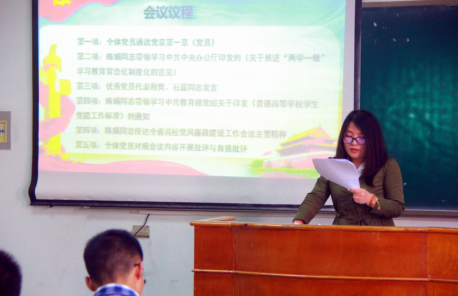最后,陈娟同志为学生党员宣读了中共教育部党组关于印发《普通高等学校学生党建工作标准》的通知,并传达了全省高校党风廉政建设工作会议的主要精神,要求广大党员提高道德修养,加强党性锻炼,增强党员意识,履行党员义务,积极服务,多做贡献。