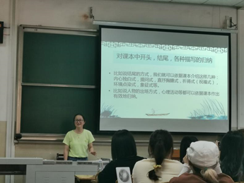 杨溯琴老师授课的主题为“我的语文教学成长之路”。杨老师首先就自己的实习经历与同学们展开互动,她认为,作为语文教师要熟悉课本,要引导学生从生活中发现美、寻找细节,并指出训练学生思维的重要性。接着,她向大家展示了自己班级学生的优秀作业视频,告诉同学们,在教学过程中关注学生是非常重要的,培养学生也是一位教师的重要成长之路。杨溯琴老师还强调,在教学中需要引导学生观察生活、回归真情,从而打造快乐轻松的语文课堂。