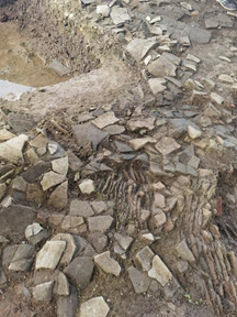 随后,师生们紧随刘老师的脚步,前往正在进行清理工作的编号为T3(注:T代表台基)的建筑台基。到达T3发掘现场后,映入师生们眼帘的是较为平整的建筑台基,台基中部保留有部分道路、立柱基底,四周有不连续的房屋墙体基底。另外,T3内分布有宋代砖室墓一座、晚清时期多座墓葬。其后,师生一行人前往位于郢城遗址南水门附近的考古发掘现场参观,现场明显可见淤泥层。通过近距离的交流和观察,同学们对于考古学科专业知识和田野考古知识有了更深刻的认识和了解。