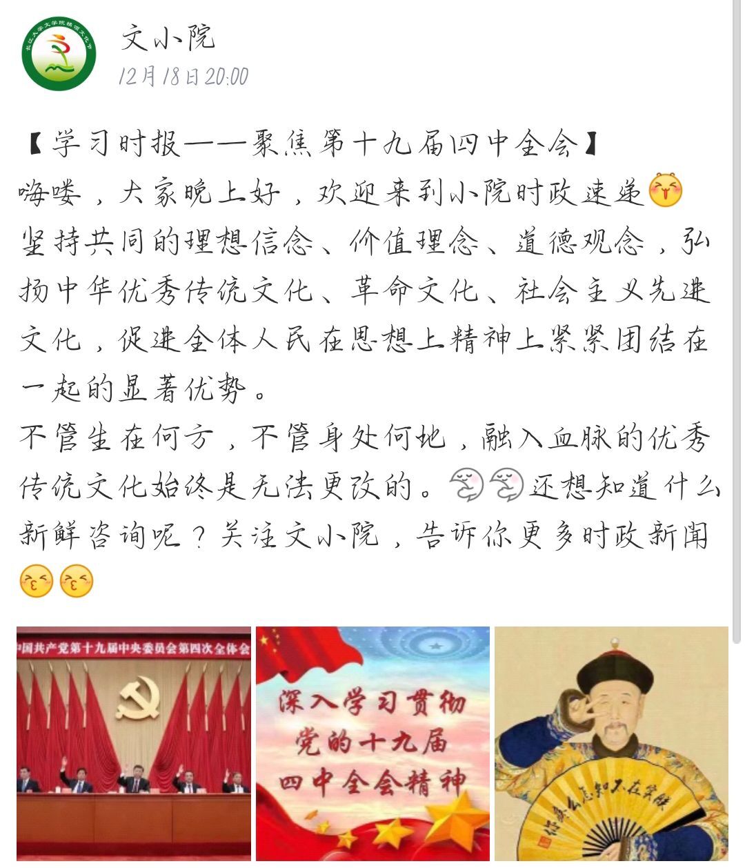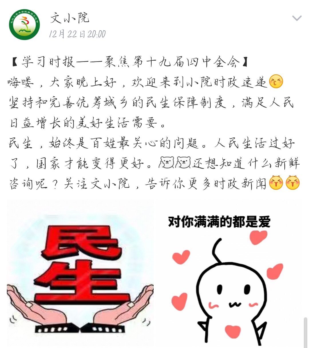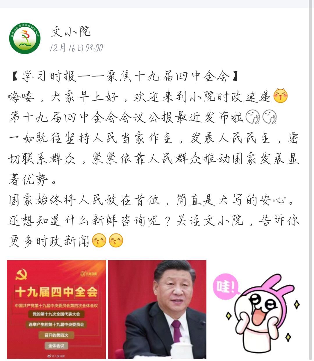 为深入学习宣传贯彻党的十九届四中全会精神,近日,伟德国际1946文学院官方QQ及微信公众号开展了以【小院带你走进不一样的十九届四中全会】为话题的宣传活动。本次活动采用学生喜闻乐见、易于接受的线上宣传与线下互动双向交流的方式,给文学院全体师生深入学习党的十九届四中全会精神带来了不一样的体验。