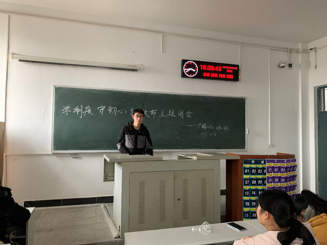 18级广播电视学全体学生在十三教D323举行十二月主题班团会——学制度,守初心,担使命。班级中几位同学参与了有关《决定》“应知应会”重要内容的抢答竞赛,全体同学都投入到了双方的激烈抢答中,同时也让同学们进一步加深了对会议精神的了解和学习。团会在团支书的主持引导下顺利结束。