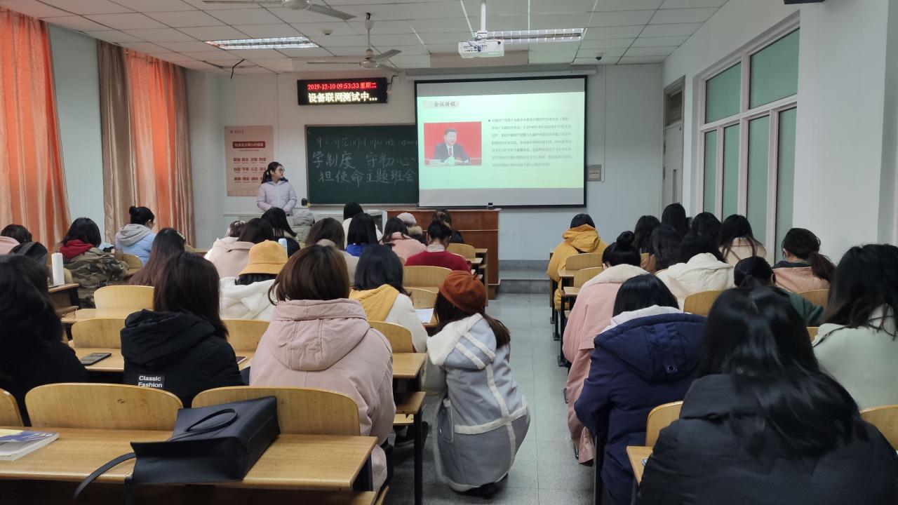 官Q从充分认识党的十九届四中全会的重大意义、党的十九届四中全会的精神实质、认真贯彻全会精神做新时代有为的大学生等方面,全面解读了党的十九届四中全会召开的国内、国际背景,以及党的十九届四中全会提出的总体要求、总体目标和重点任务。希望同学们深刻领会全会精神,做一个志存高远的“有梦人”,做一个锐意进取的“追梦人”,做一个勤学善思的“筑梦人”。
