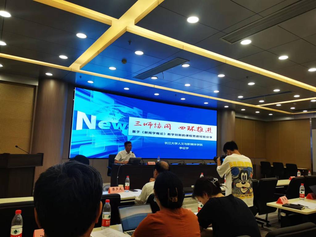 在大会发言环节,来自武汉大学、华中科技大学、湖北大学、湖北第二师范大学、伟德国际1946、湖北师范大学等高校的专家分别介绍了本校新闻传播学课程思政的经验做法。我院副院长李征宇以《三师协同,四环推进——基于〈新闻学概论〉教学创新的课程思政经验分享》为题进行报告,他分别从课程概述、教学创新、课程思政、评价成效四个方面介绍本院《新闻学概论》建设的主要特点,尤其是在课程思政方面的具体做法与创新特色,着重介绍了本院如何运用课程导师、业界导师和学长导师三师协同教学机制,利用察、探、究、用四个环节融合课程思政元素,加强学生的思想引领和实践技能提升。同时,李征宇还介绍了8月在西安交通大学参加第二届全国高校教学创新大赛的情况以及本院参赛的经验,受到与会教师的广泛关注。在分组讨论环节,陈红莲和纪希老师分别就新文科背景下新闻传播学专业课程和实践课程思政建设要点发表自己的看法。