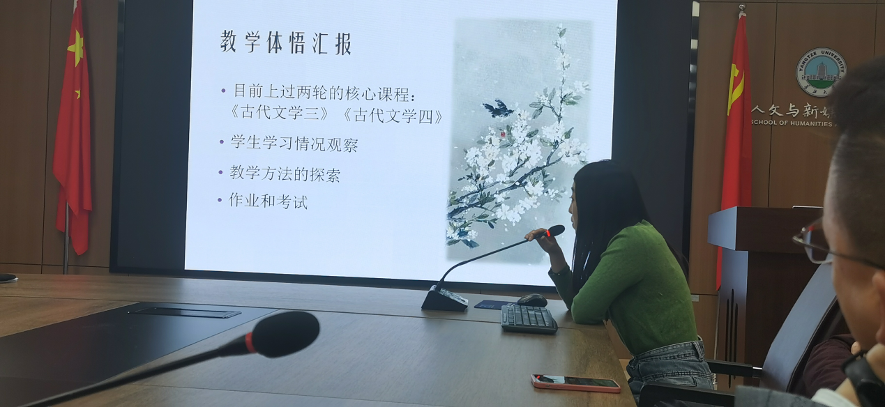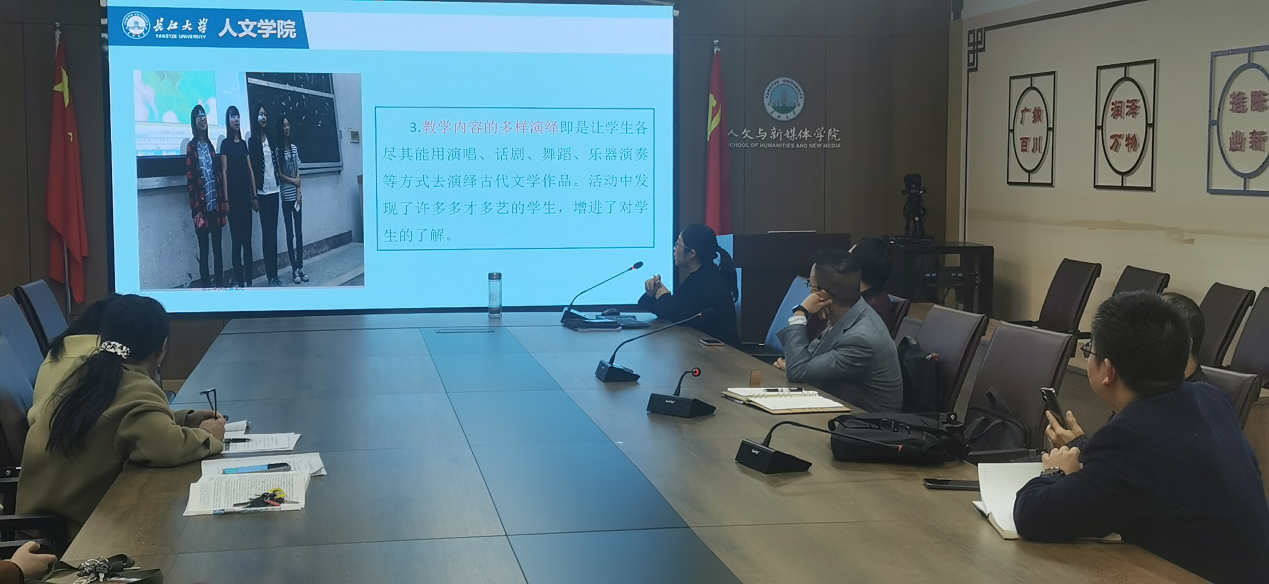 为加强课堂教学改革和过程性评价体系,会上还举行了教师教学经验交流会。吴桂美老师从课堂的有效性建构、教学与科研相互转化、教学改革的反思几个方面,系统全面地阐述了自己的观点。她提出建构课堂的有效方法:比如利用好课堂前的10分钟预习和知识点准备工作;分享教学资源,扩大学生的接受视野;对作家作品进行多元化解读尝试,拓展学生的思维训练;走出课堂,将理论课堂带入生活实际中;充分利用大学生创新创业大赛和微课比赛等实践平台,以赛促学,并定期举办相关读书报告会;将自己主持的古代文学等省级教学课题转化为课堂教学资源,形成活的教学理念。另外,她还从教学与科研相互转化的辩证关系,举例阐述了课堂教学中要融入自己的科研成果、教学中的问题凝练为项目选题的良性循环路径与方法。并结合中学语言的教学改革思路,给出了自己的前瞻性反思,从而进一步推动高校与中学的教学有效性衔接。