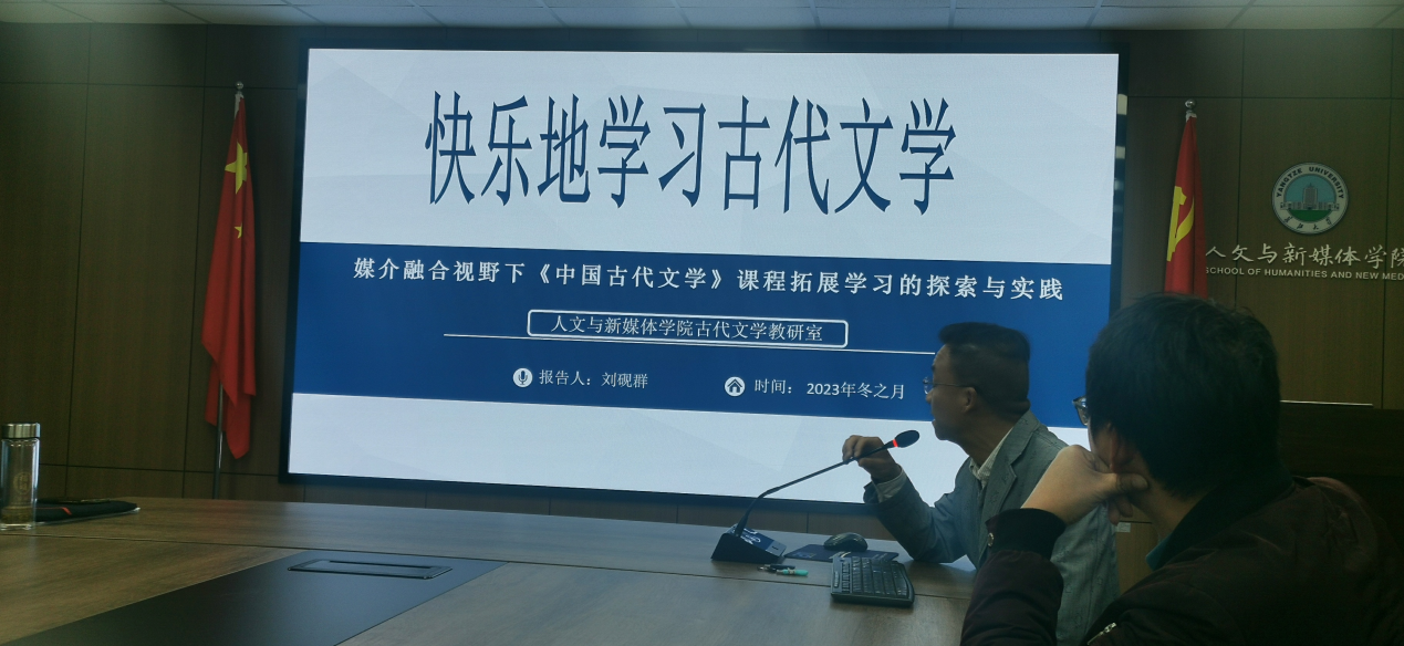 刘砚群老师从媒介融合视域下,如何高效快乐地从事古代文学教学做了深度思考。他以事实数据为基础,分析了当前大学生的学习现状不容乐观。但信息技术的高速发展,给当代大学生的学习带来了新的契机,进而从目标定位、习惯养成、情感涵养和人文品格的培育几个方面做了概括论析。他认为,只有尽快掌握最新的信息技术手段,并实质性地融入到课堂教学过程中,才能让传统的教学焕发出新的生命和光彩。他以自身所讲授的古代诗词为例,阐明了借鉴不同媒介,打造一“画”一“曲”一“视频”的活课堂理念。比如,诗词需要凝练为幻想(画意),也体现在歌唱(乐感),同时也需要穿越时空的感同身受(情景剧),最终结晶为媒介融合的成品(微视频),这样遵循诗歌美学规律而创作成形的跨媒介作品,不仅实现了跨越时空的沉浸式体验观感,也给课堂带来了新鲜的体验和深度交流。