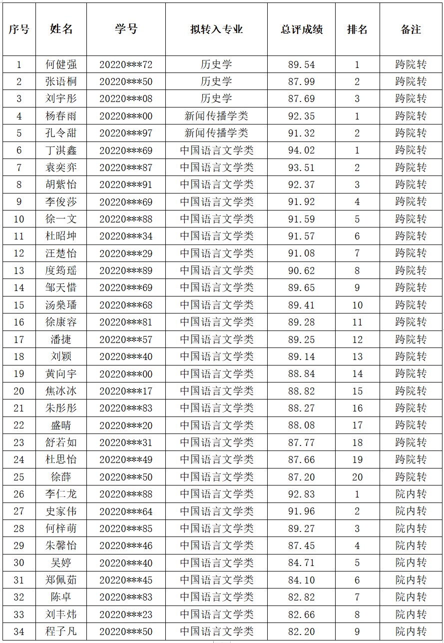根据必修课成绩、笔试成绩和面试成绩的总评成绩排名,报学院党政联席会议讨论通过,拟接收何健强等25位同学转入我院,拟同意本院历史学、新闻传播类的9名学生转入中国语言文学类。现将推荐名单的总评成绩按序公示如下。