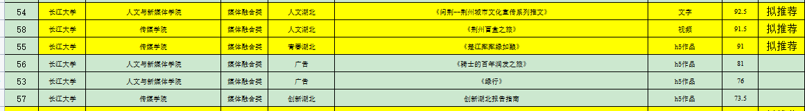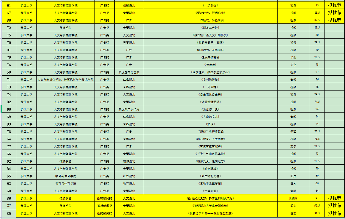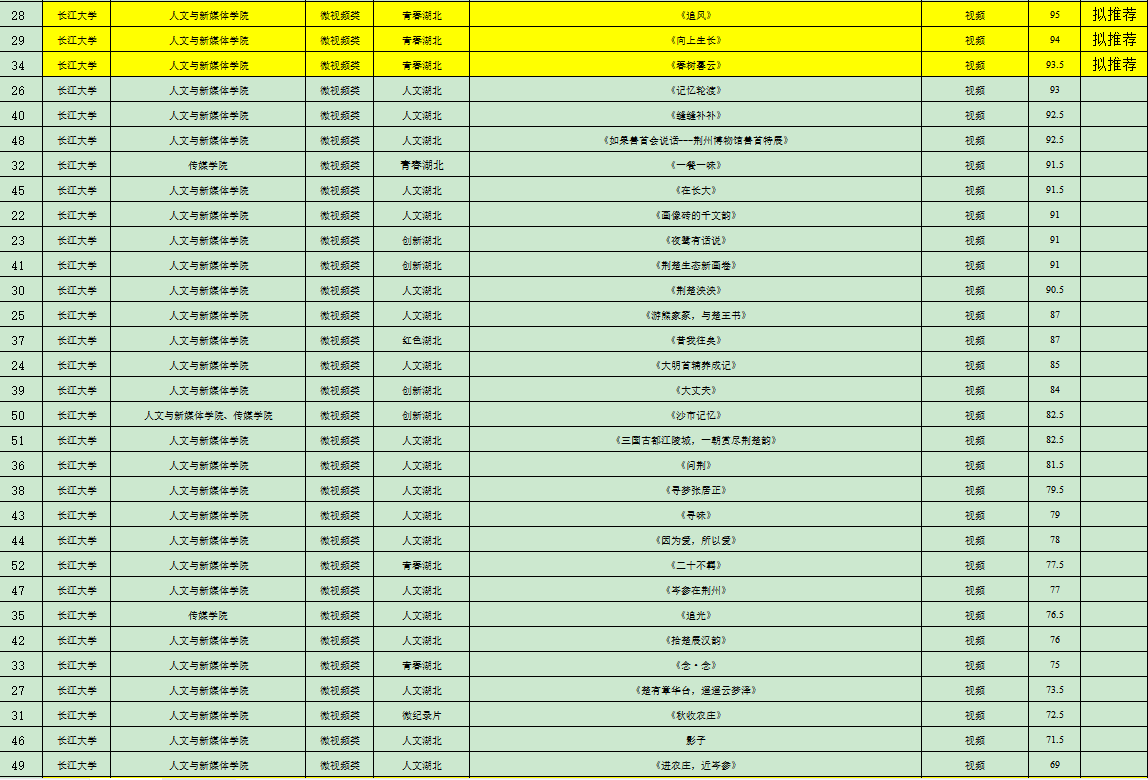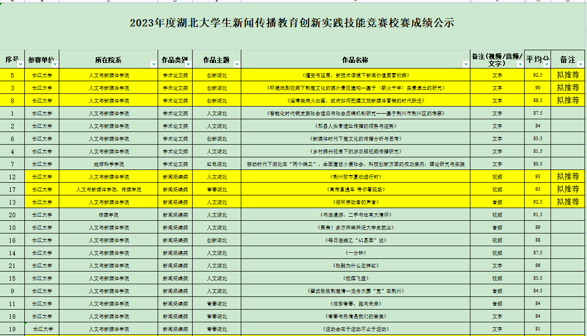 6月21日至25日,经人文学院与传媒学院商定,邀请两个学院未指导本次比赛作品的教师以及荆州广播电视台相关业内专家共计8人组织评审组,独立评审打分,综合成绩后计算平均分,从高到低进行排序,根据2023年度湖北省大学生新闻传播教育创新实践技能竞赛方案要求,每校每类别推荐不超过3项。现将结果公示如下: