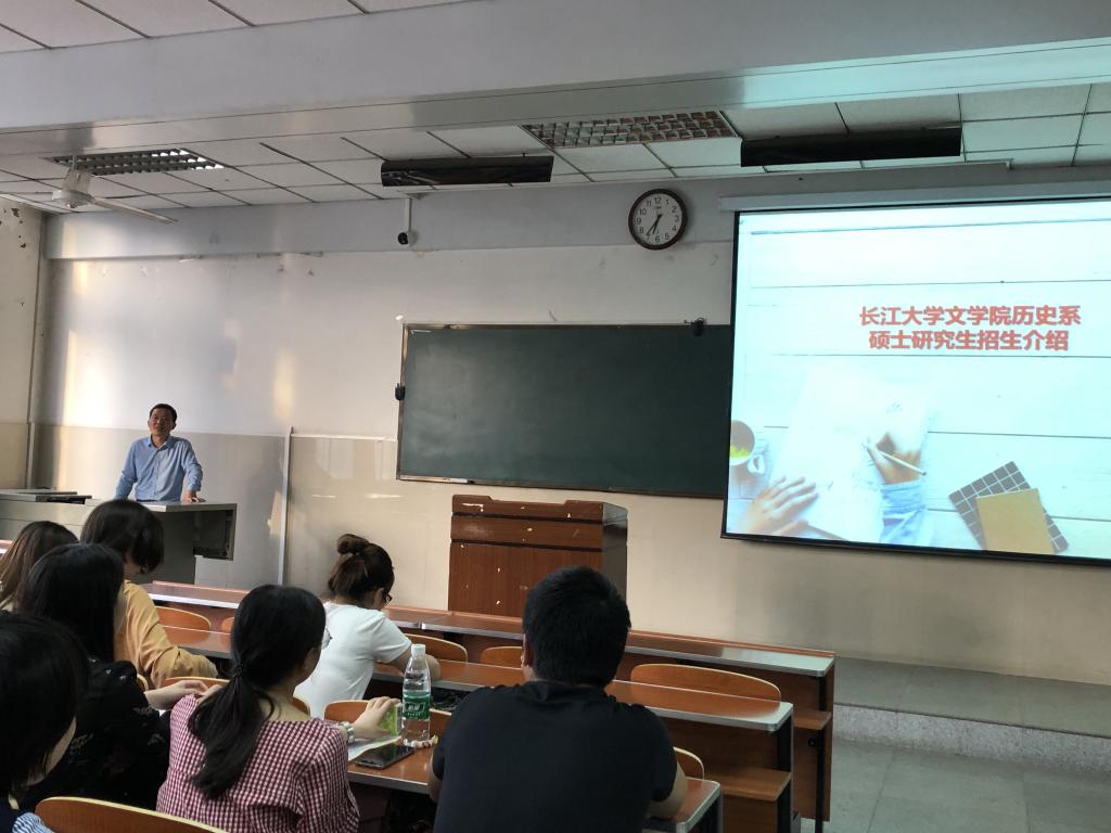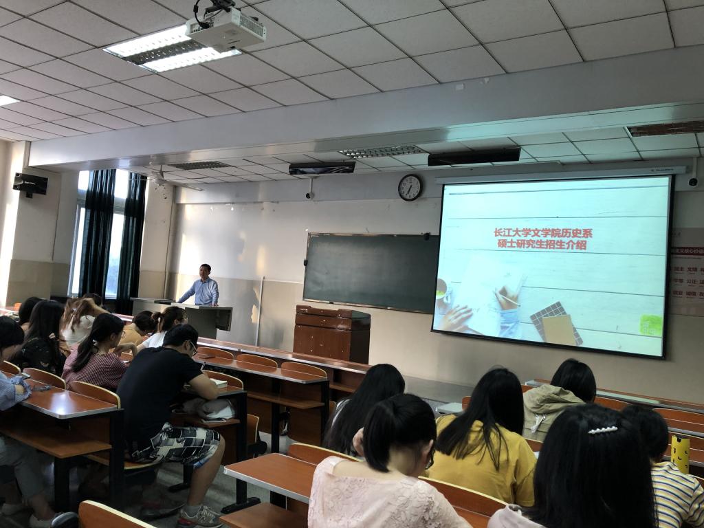 (通讯员 顺畅)5月22日晚7点,文学院历史系在12教301开展了一场2020年研究生招生与推免讲座宣传,历史系主任卢川老师发表主要讲话,班主任陈先蕾老师进行补充发言,16级历史系全体同学参加。