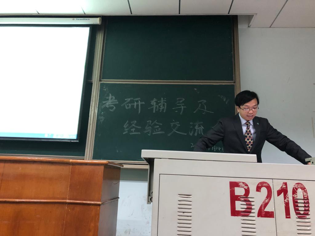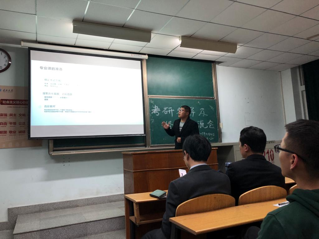 接着,由考研成功的学长、学姐分享考研经验。戴昌茂学长用两组数据指出了报考本校的优势,并鼓励大家报考本校。包宝伦学长给大家推荐了考研书目并分享了自身考研的方法,如:利用微信公众号、APP、百度网盘等工具搜集考研资料;重视历年真题,最好一篇一篇的过,一遍一遍刷;合理安排复习时间,前期重视专业课和英语,后期开始复习政治,考试时间上勿以熟悉而多写,勿以陌生而不答。张畅学姐特别强调了英语的重要性,学生可以结合自身的英语水平选择报考院校。刘迪学姐指出在复习时应尽可能的阅读多版教材,多研究历年真题,通过时间规划表合理安排复习时间。易文艳学姐给大家提供了一些心态上的建议,如:注意劳逸结合,避免长时间、高强度学习 ;后期要注意调整心态,不想太多,不放弃,把考研当做一项平常的任务;复习时不要自我感动,不要盲目复制别人的成功,找到属于自己的方法。