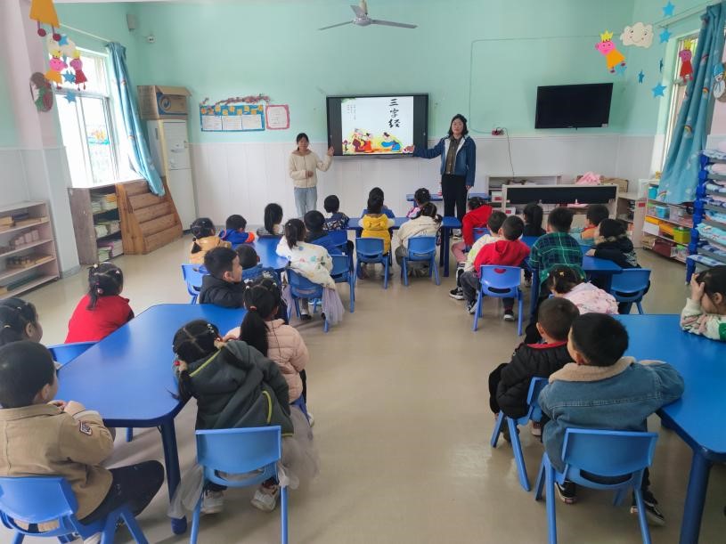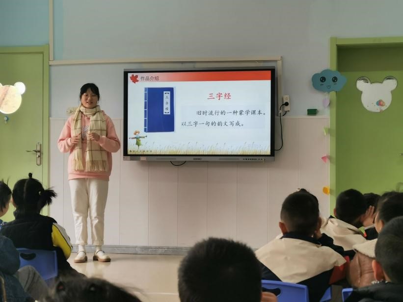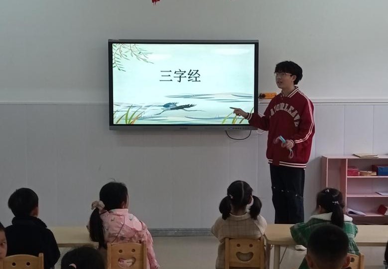 本周国学课程共进行了5天,15名志愿实习讲课学生自行组队,各自选定授课时间段及班级,并自行选择讲课内容进行20至30分钟时间的授课,授课班级为4个中班和3个大班,每班30名小朋友。同学们选择《三字经》《百家姓》《弟子规》、唐诗等国学启蒙文本,运用在课堂上所学的语文教学技能,精心备课,并结合图片、歌曲、吟诵、手语等丰富的形式,引导幼儿园的小朋友们体验国学的精髓。课堂上,幼儿园的小朋友们活泼可爱、热情礼貌,踊跃回答同学们的提问,体现出伟德国际1946幼儿园在幼儿教育方面颇有成效。