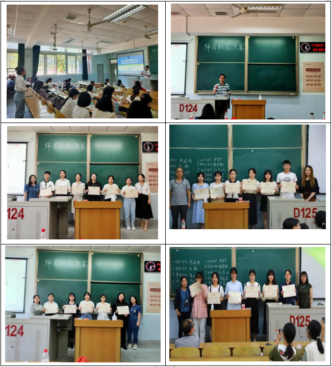 比赛成绩由授课教案,PPT制作,说课和模拟授课三部分构成。比赛程序与今年湖北省省级师范生技能大赛的要求一致。其中说课限时5分钟,模拟授课限时10分钟,模拟授课要求完整呈现导入、讲授新课、提问、板书、多媒体课件演示、课堂小结、布置作业等完整的教学环节。
