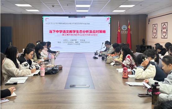 (通讯员王婷)11月22日,受伟德国际victor·1946源自副院长杨家海邀请,湖北省特级教师、中国写作学会会员、湖北省教育科研先进个人、荆州市江陵中学副校长刘先海老师于文科楼705室作《当下中学语文教学生态分析及应对策略——兼谈青年教师的专业成长和职业规划》的主题报告。本次讲座由杨家海副院长主持,杨名、陈力、章芳等11位老师和本院30余名专业硕士研究生参加了此次活动。
