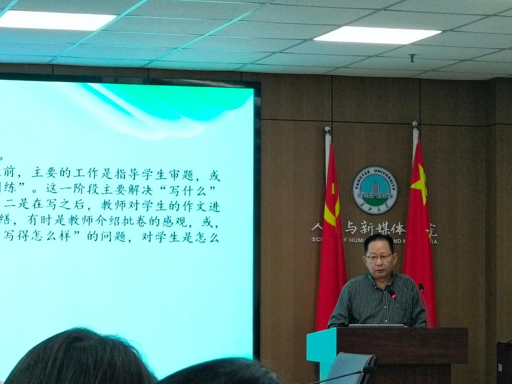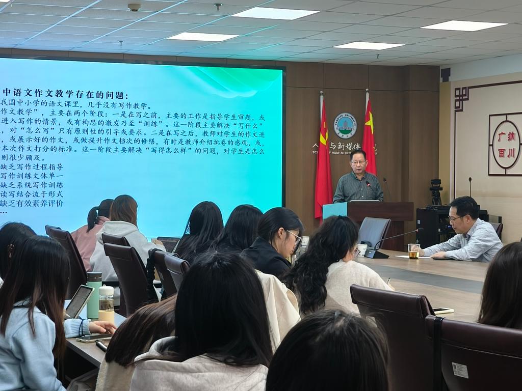 为增加在校语文师范生对于高中语文教学的认识,深入了解作文教学实践,我院于2024年11月12日邀请荆州市高中语文教研员刘基华老师在文科大楼705开展以《高中语文作文教学与备考》为题的讲座。本次讲座由院长何世龙教授主持,章芳老师、吴桂美老师出席,学科教学语文23级、24级研究生积极踊跃地参与。