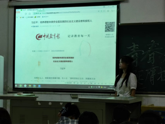 然后带领大家学习习近平总书记重要文章《培养德智体美劳全面发展的社会主义建设者和接班人》,明确全面发展的人才培养目标,引导团员青年立志肩负起民族复兴的时代重任,同时让爱国主义精神在学生心中牢牢扎根。