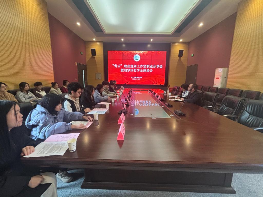 (通讯员 杨敬萱)12月1日下午,“青云”职业规划工作室职业发展分享会暨胡罗珍奖学金座谈会在农科大楼1057会议室举行。2009届校友胡罗珍、学院党委副书记竺正海、辅导员归航、10名胡罗珍奖学金获得者以及2024级学生代表参加了本次座谈会。