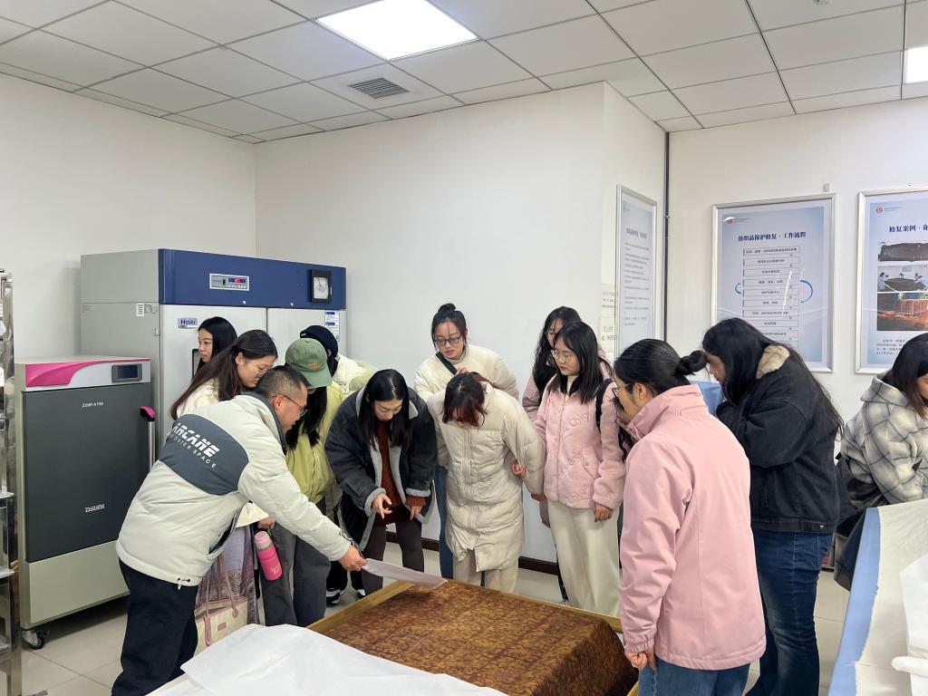 随后,师生们步入丝织品修复室,一件战国时期的丝织品吸引了大家的注意,据吴昊介绍,这件战国织物由三个部分拼接而成,经修复后,可根据三部分的织纹大致推断当时的衣着风格与文化好尚。在修复室的一角,一件巨大的荒帷让大家颇受震撼,荒帷又称棺罩,材质保存极为困难,而这件出土于荆州谢家桥一号汉墓的荒帷经过荆州市文保中心的精心修复后,最终得以完整保存,甚至面料上的绣制的花卉和走兽纹饰都清晰可辨,大家再一次惊叹文物修复技艺的神奇。