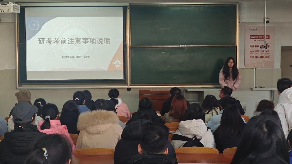 会议伊始,2024级研究生石梦娜同学结合自身考研经历,做了一场干货满满的考前调适分享。她详细讲述了自己在研考期间的时间规划、学习方法以及心态调整策略,并鼓励学弟学妹们在最后的备考冲刺阶段要树立信心,保持积极稳定的心态,合理安排作息时间,以最佳状态迎接考试。
