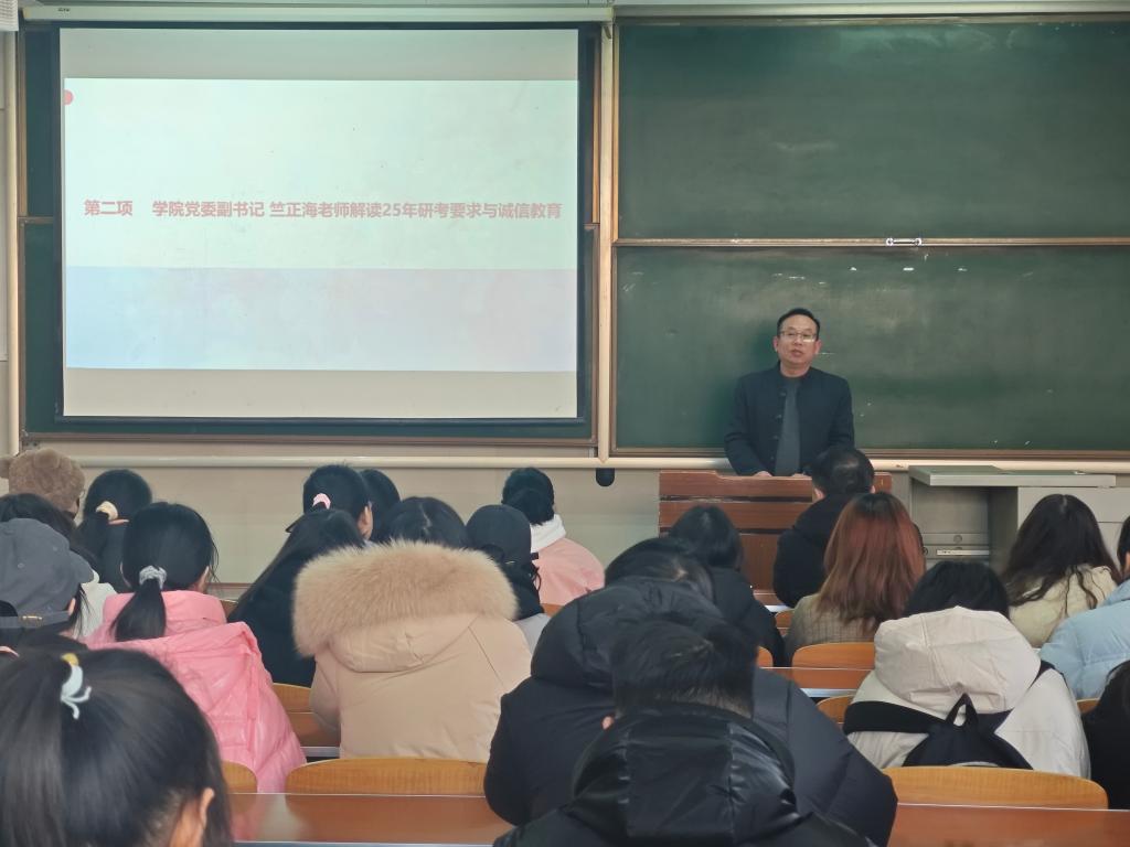 (通讯员 胡雪芬)为助力学院研考学子积极备考、沉着应考,增强诚信考试意识,12月19日下午,学院在东校区主教108室举行2025年研究生考试动员暨诚信教育大会。学院党委书记李波、党委副书记竺正海出席,学院2025年研考学子参会。活动由2021级本科生辅导员彭超主持。