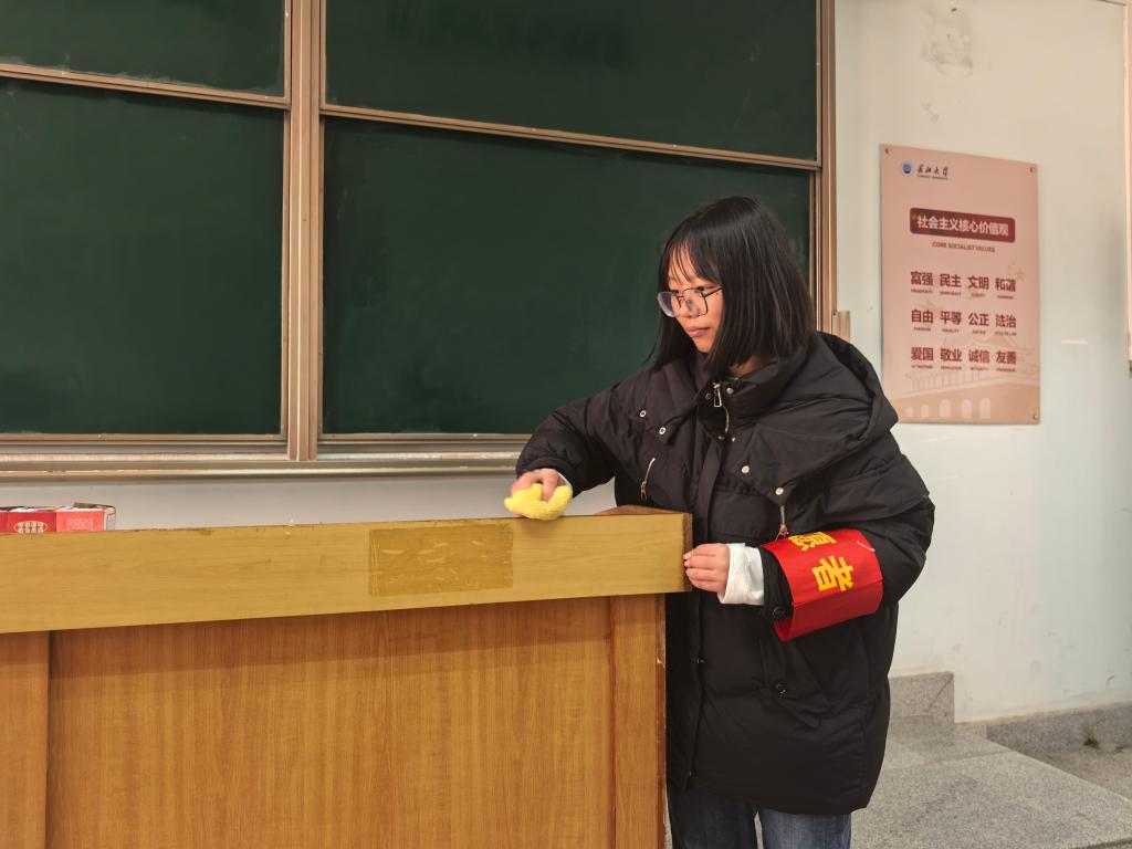 下午4时,志愿者分两组开展环境整治:一组清理主教楼周边垃圾并规范车辆停放;另一组深入30余间教室,完成黑板擦拭、课桌清理及卫生死角清扫。志愿者李淼表示:“清洁工作是对‘螺丝钉精神’的诠释,唯有从点滴做起,才能让雷锋精神融入日常”。