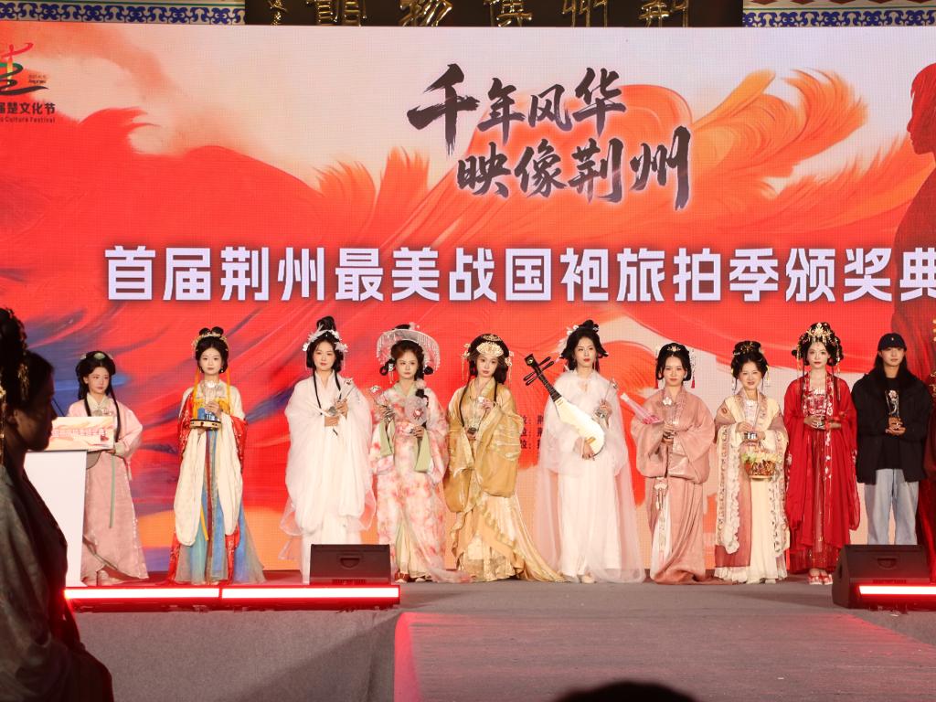 学院李征宇副院长受邀担任本次战国袍旅拍季颁奖典礼的开奖嘉宾。在揭晓“荆州最美战国袍”大奖之前,他表达了对此次活动的文化意义的肯定:“这不仅是对传统文化的保护性传承,更是一次创新性转化,以‘衣冠’为媒,为荆州文旅融合发展注入了独特的文化符号与情感记忆,这份意义远超一场评选,是荆州文化自信的生动表达。”同时也鼓励现场参与人员和学生沉浸式参与,去触摸、去欣赏楚人的浪漫想象和时代的审美风骨。