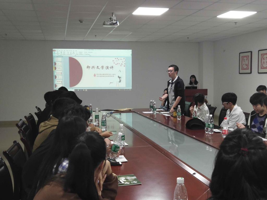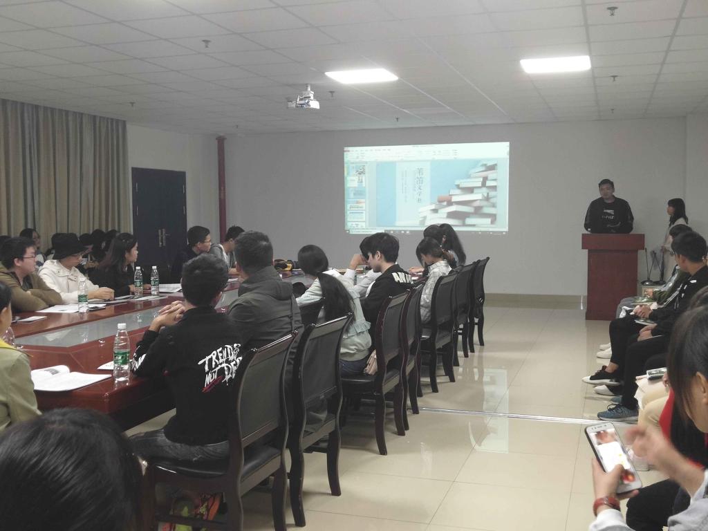首先,各个社团派出一位代表用PPT向全体与会人员分别介绍有关社团历史、社团现状、部门情况、社刊社训、发展愿景等方面的基本社团信息,展现了各自的风采。随后,与会人员进行了即兴文学演讲,即每位发言者选取一部或多部对自己影响深刻的文学作品,对其发表看法,同时,其他未发言人员就进行演讲者所说的作品进行探讨,从而造成了不同文学思想的碰撞与交流。接下来,会议进入到生动活泼的游戏环节。本次会议共设有三个游戏,即成语接龙、魔鬼诗典与击鼓传花。游戏过程中,来自不同社团的代表积极参与,增进了彼此间的了解,建立了深厚的友谊。最后,本次会议以一张合影的形式圆满结束。