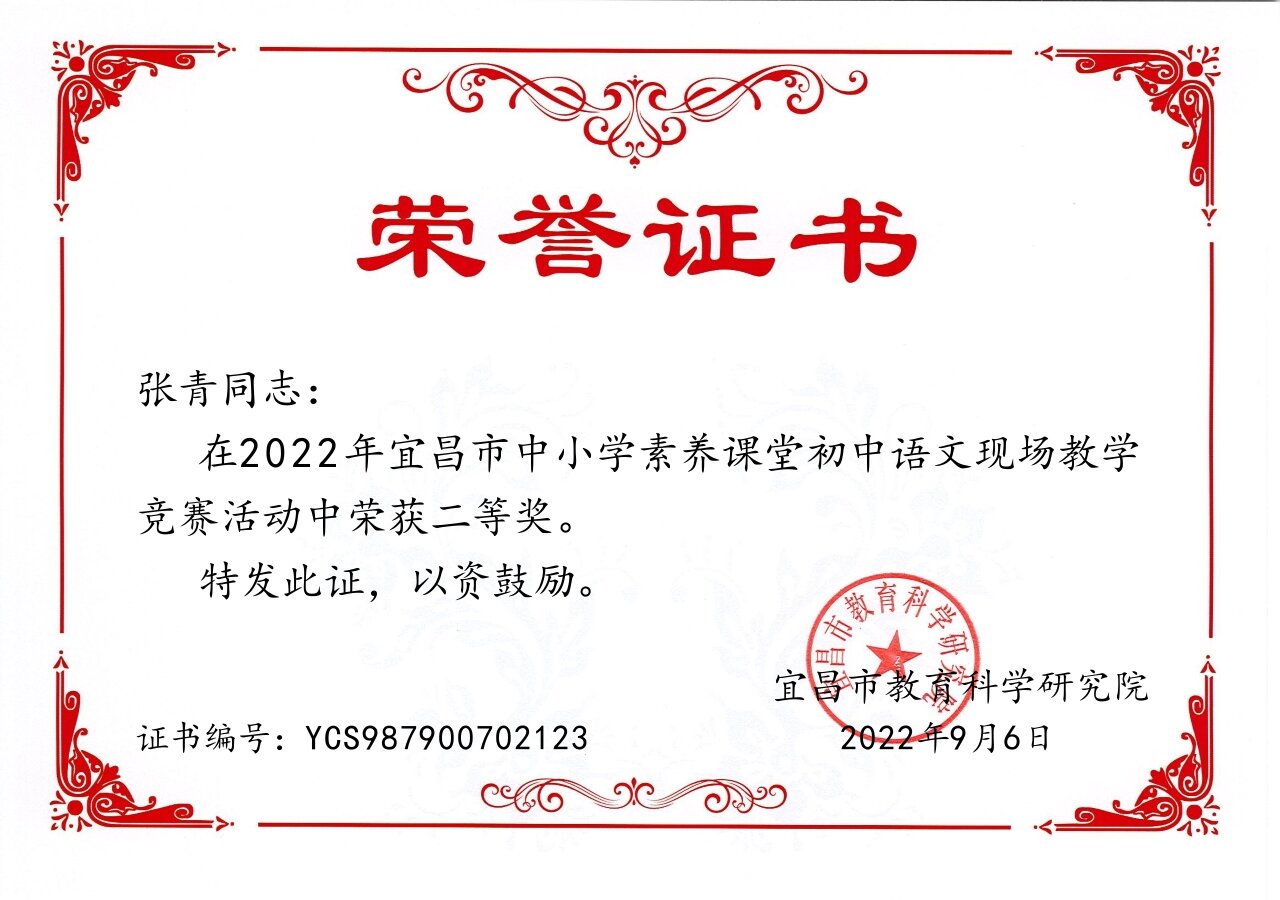 自从走上教学岗位伊始,她就把“教书育人”作为自己的责任和使命,时刻反思“为谁培养人、培养什么人、怎样培养人”这一根本问题,不忘立德树人初心,牢记为党育人、为国育才使命,用自己的学识、阅历、经验点燃学生对真善美的向往。她始终热爱自己的工作,以教师的身份为荣,把工作放在首位,在教学教研上虚心学习,不断“充电”,认真学习新课标,钻研教材,积极摸索适合自己的教学风格,努力做到教师乐教、学生乐学。2022年,经过层层选拔,她代表枝江市参加了宜昌市中小学素养课堂初中语文现场教学竞赛并获得二等奖,是参赛老师中为数不多的青年乡村教师。