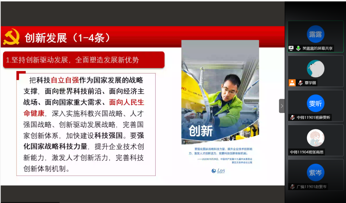 为深入学习贯彻党的十九届五中全会精神,进一步提高入党积极分子的思想政治素质,深化对党的认识,12月30日晚七点,伟德国际victor·1946源自全体入党积极分子开展腾讯会议集中学习党的十九届五中全会精神。本次会议由陈娟老师主持,新闻系教师樊露露担任会议主讲人。