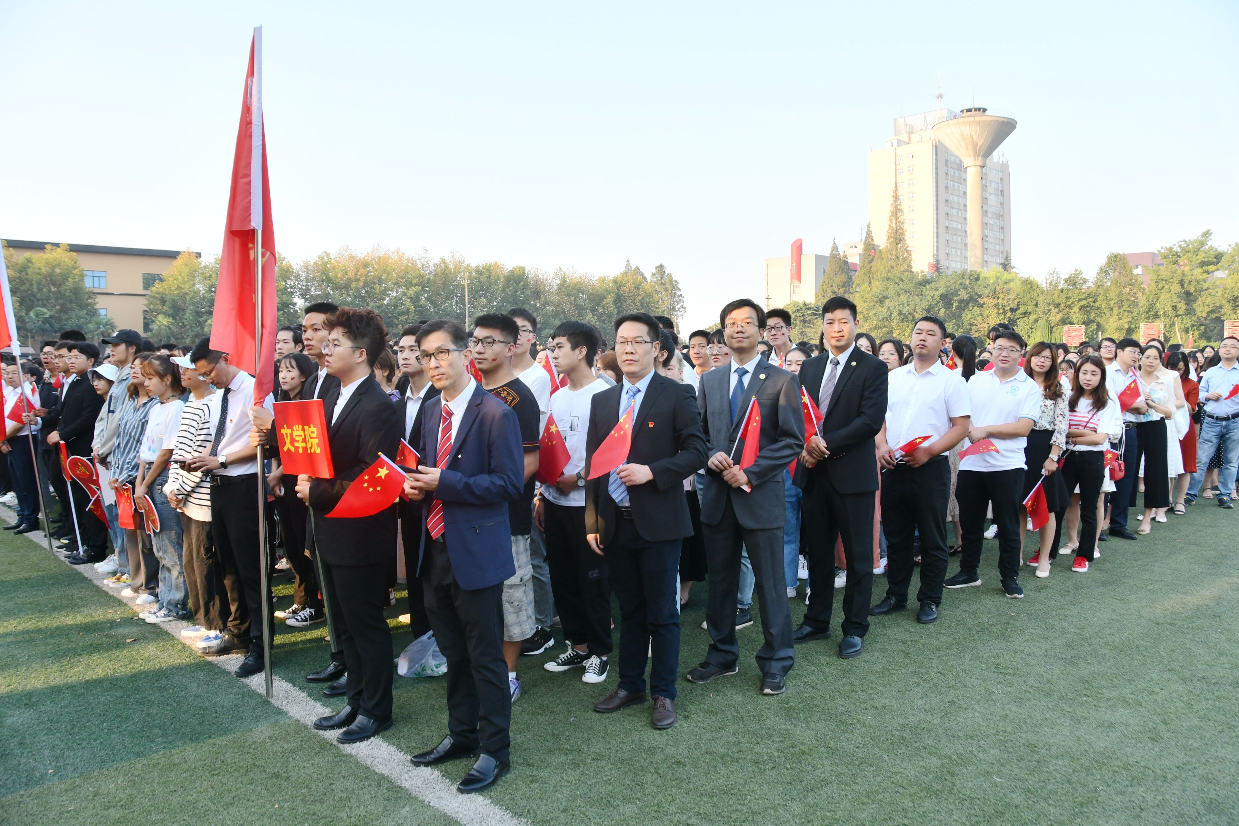70年初心如磐,70年砥砺前行,70年风雨兼程。在中华人民共和国70岁生日当天早上7点,文学院全体院领导及留校师生齐聚东、西校区操场,参加国庆升旗仪式,以这一庄严神圣的方式向伟大祖国、伟大时代致敬献礼!文学院师生与学院书记杨克非、院长何世龙一起挥舞国旗,齐唱《我和我的祖国》,表达了对祖国生日的祝福。