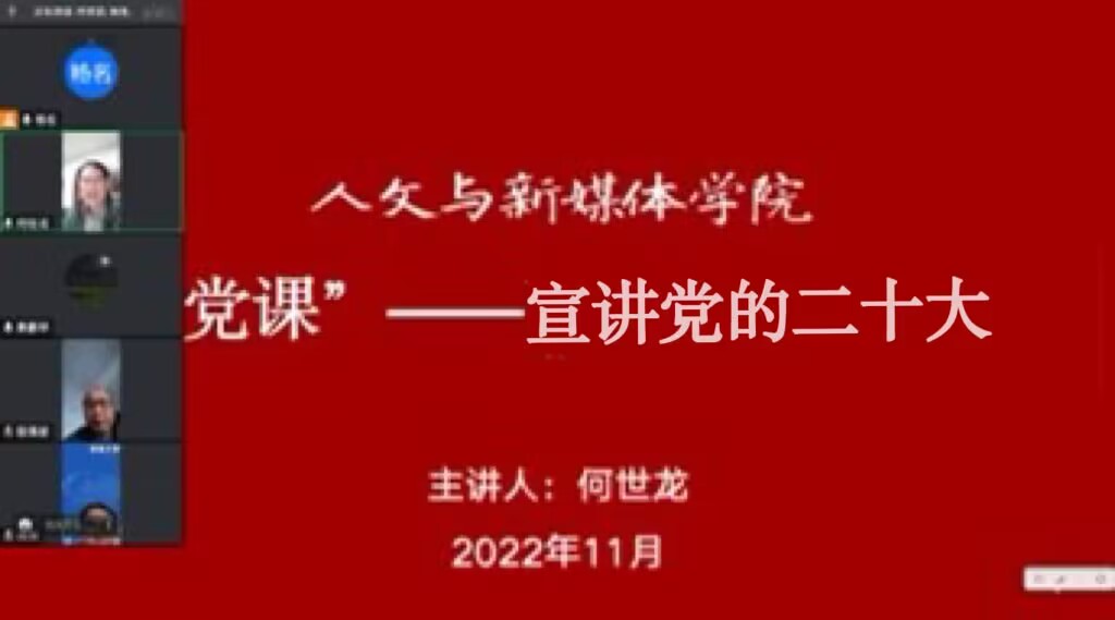 为积极响应党员干部“下基层察民情解民忧暖民心”实践活动,引导教师党员进一步学习贯彻党的二十大精神,11月28日,学院院长何世龙以“党的二十大精神”为主题,为中文专业教工党支部作主题党课。