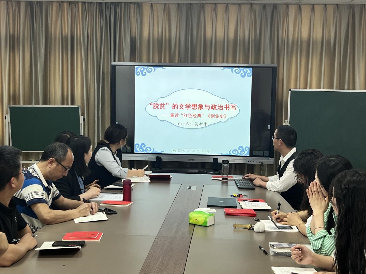 本次主题党日活动中,吴新平老师讲授了题为《重读“红色经典”〈创业史〉》的微党课。吴老师结合“脱贫”这个主题对柳青的长篇小说《创业史》进行了解读,认为《创业史》立足于新中国成立后农村社会贫富分化的现实矛盾,以社会主义现实主义的精神对建国初期农村脱贫展开文学想象,实现了“只有社会主义才能摆脱贫穷”的政治书写。