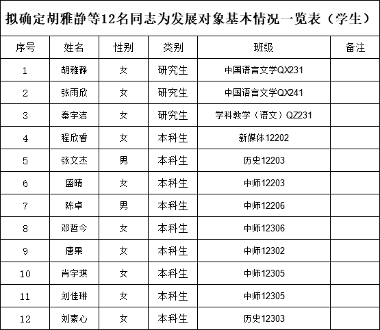 附:拟确定胡雅静等12名同志为发展对象基本情况一览表(学生)