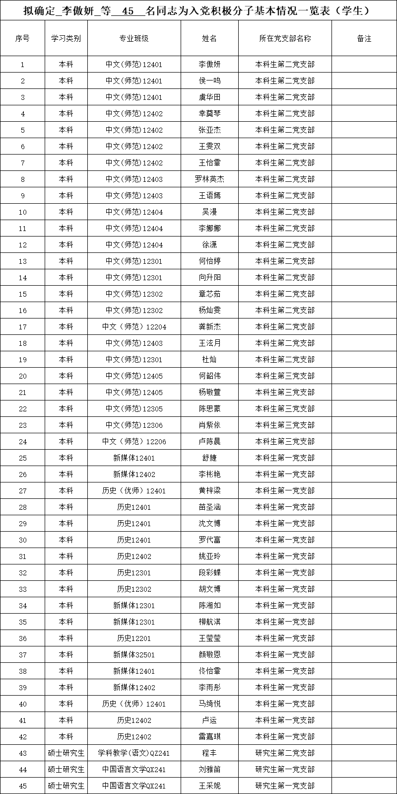 附:拟确定李傲妍等45名同志为入党积极分子基本情况一览表
