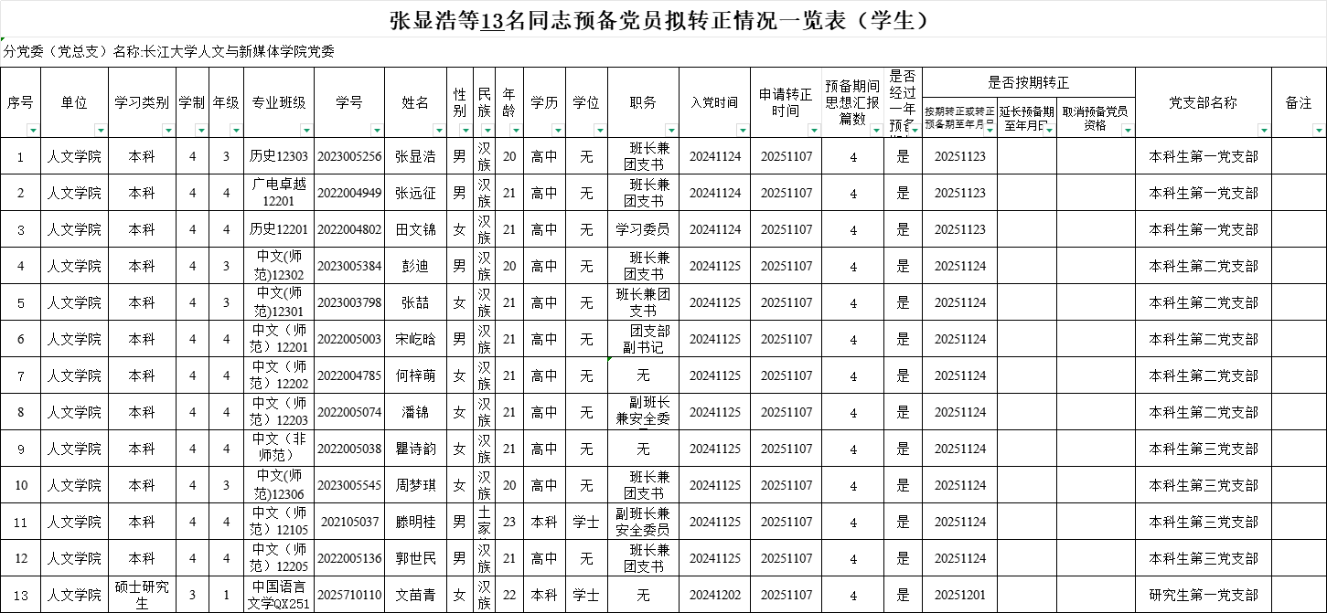 附:张显浩等13名同志预备党员拟转正情况一览表
