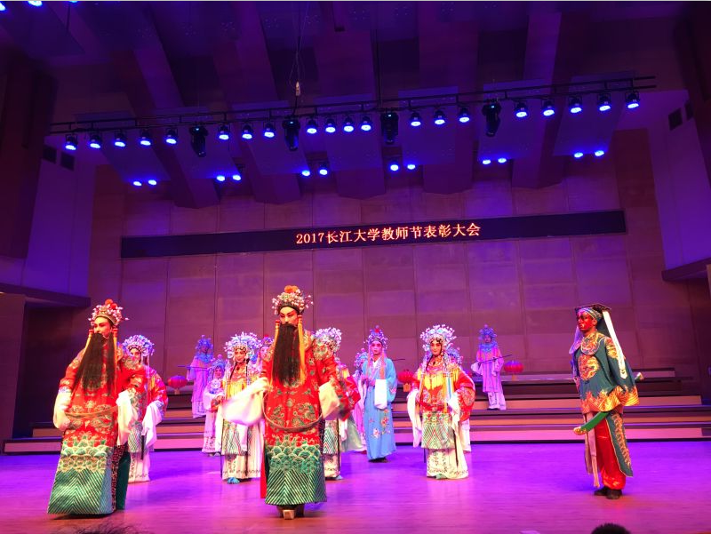 (通讯员 李思源 桑俊)9月8日晚7时,2017年度伟德国际1946教师节表彰大会在艺术学院音乐厅隆重举行。文学院、体育学院、艺术学院、校工会等都为表彰大会精心准备了各类节目。感人肺腑的诗朗诵,满怀深情的独奏,激动人心的群舞等,文学院荆河戏传承基地也特别排演了荆河戏《百花亭》,献礼表彰大会。华美精致的戏服,光彩夺目的妆容,传统韵味的配乐,再加上师生们的倾情演绎,那一刻,台上台下的视线都凝聚在一起,掌声雷动,首演获得了一致的好评。