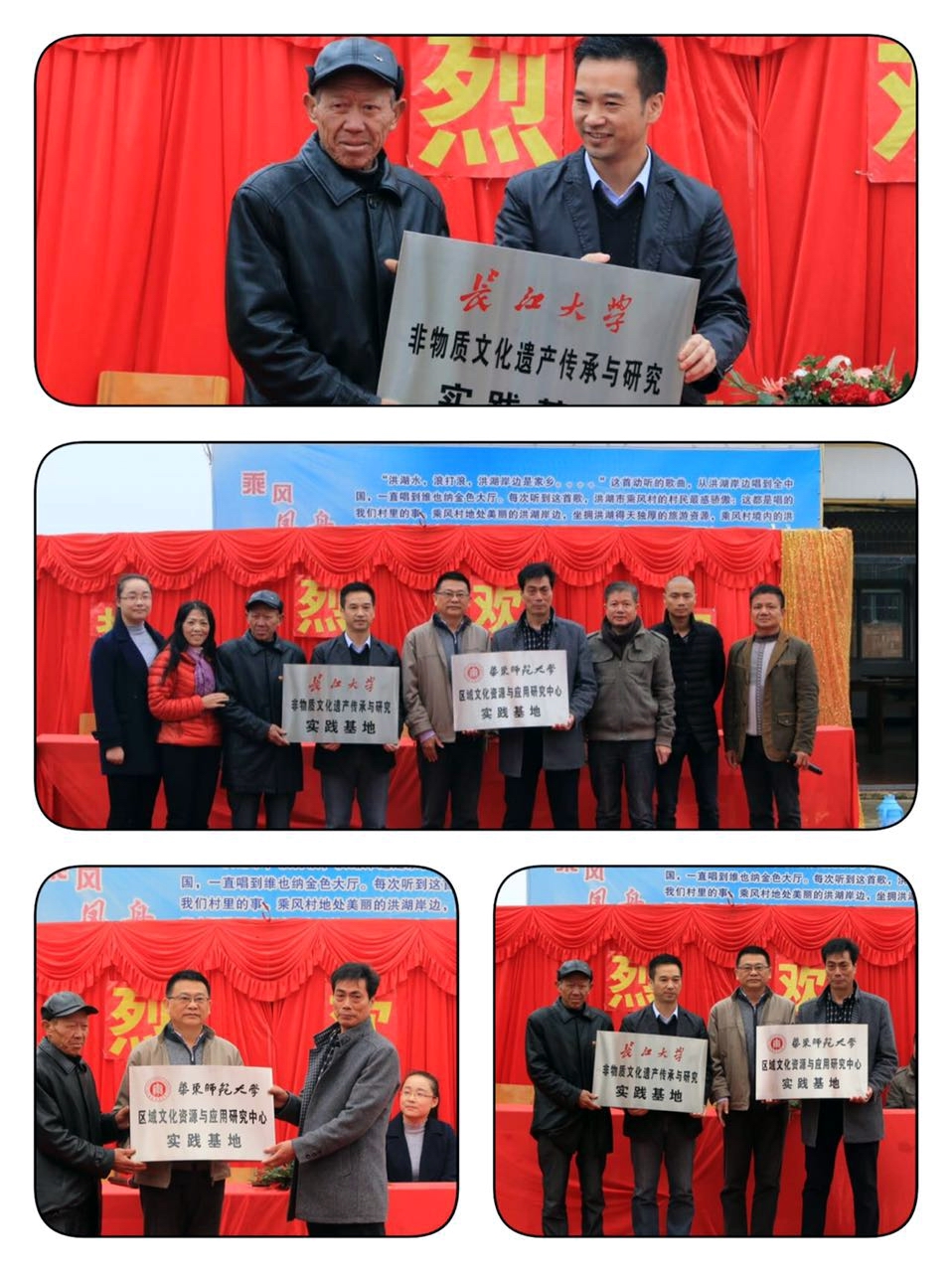 (通讯员 桑 俊)11月1日, 伟德国际1946“非遗传承与研究实践基地”授牌仪式在湖北省洪湖市滨湖镇乘风村成功举行。湖北省非物质文化遗产研究中心(伟德国际1946)主任桑俊、文学院党委副书记周书航、洪湖市群众艺术馆馆长叶茂、滨湖镇办事处宣传办公室主任徐琴、文化站站长刘久一、乘风村村民委员会主任张国杰、书记连习兵、乘风村凤舟协会会长夏洪树以及部分村民参与了授牌仪式。华东师范大学社会发展学院田兆元教授也参与了授牌仪式,并代表华东师大社会发展学院授予乘风村为该校的“区域文化资源与应用研究中心实践基地”。