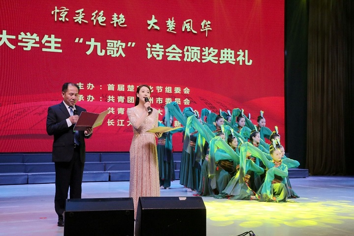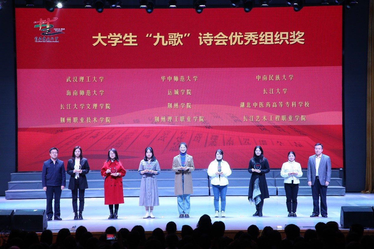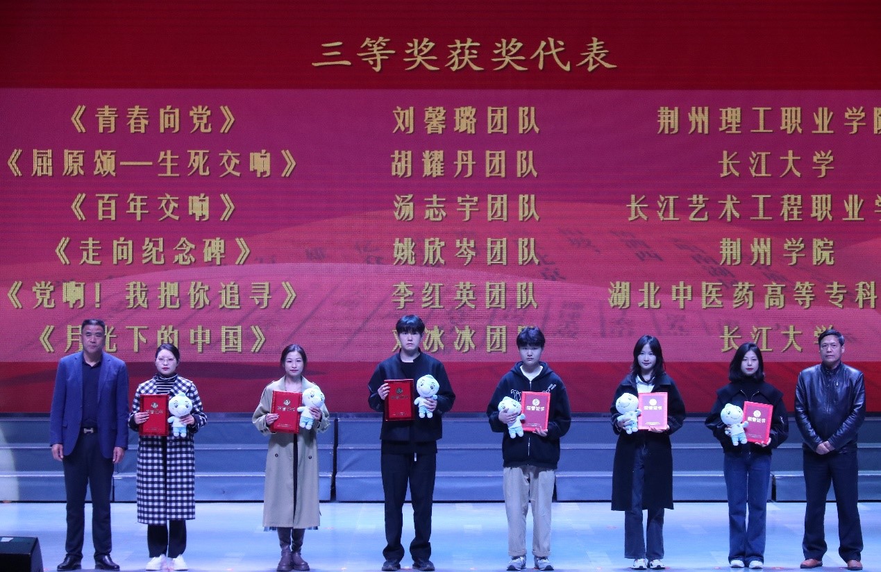 荆州市相关部门领导与在荆高校领导等为朗诵类获奖选手代表颁奖。