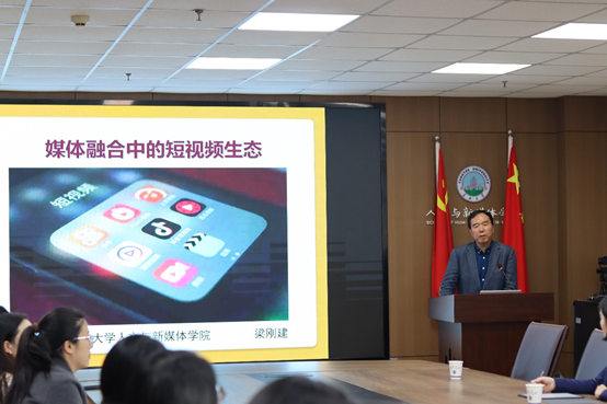 (通讯员 张光宇)10月23日下午四时,伟德国际1946人文讲坛第140讲在文科大楼705顺利举行,享受国务院特殊津贴的专家梁刚建高级编辑受邀为学院师生作题为《媒体融合中的短视频生态》的学术报告,本次讲座由伟德国际victor·1946源自副院长柯艺主持,荆州区融媒体中心刘秋娥主任及其团队、陈儒等教师代表及本院80余名学生参加此次讲座。