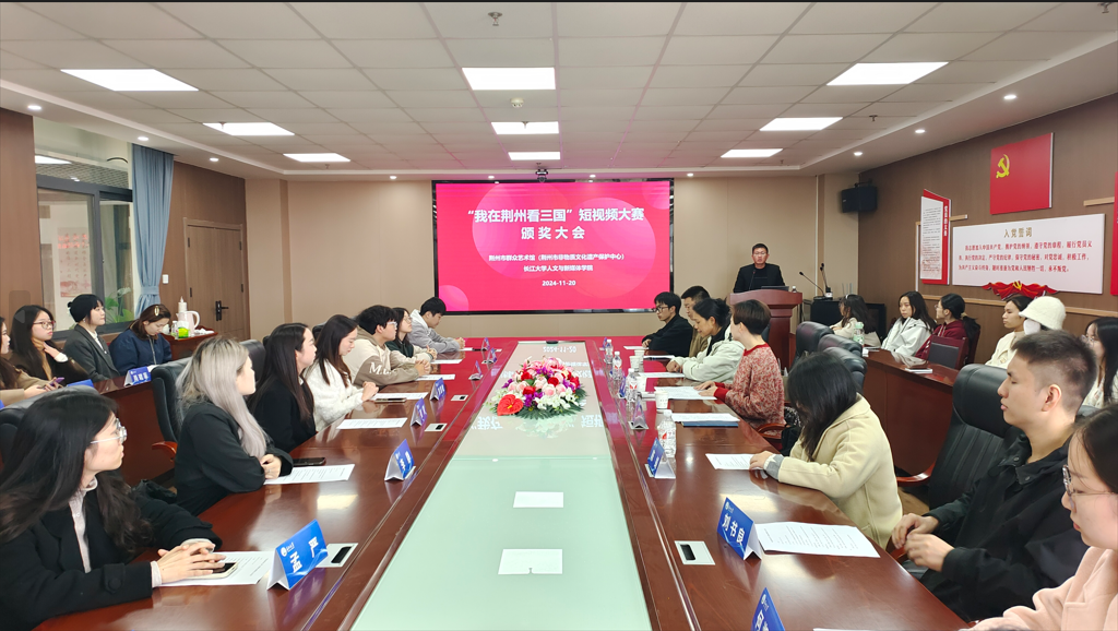 11月20日下午,我院联合荆州市群众艺术馆在文科楼905会议室举办“我在荆州看三国”短视频大赛颁奖大会,荆州市群众艺术馆馆长周晶、非遗科科长王芬芬,学院辅导员陈娟老师、耿传令老师及全体获奖同学参会,会议由学院副院长李征宇教授主持。