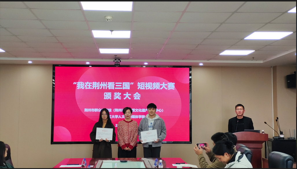 会上,播放展示了本次比赛一等奖视频作品和部分二等奖视频作品(共5部)。随后,荆州市群众艺术馆周晶馆长致辞,她表示,本次大赛受到了大学生的普遍关注,大家本着对荆州三国文化的热爱,运用短视频的方式拍摄眼中的三国,内容丰富、形式活泼,体现出当代大学生对于传统文化的理解与推崇。本次短视频大赛是荆州市群众艺术馆推动加强荆州文化资源保护和推动文化创新发展的一种尝试,也是面向全社会,尤其是大学生朋友推介宣传荆州丰富多彩的历史文化的一种尝试。同时,诚挚地邀请各位师生朋友们积极投入到挖掘、整理、宣传、推介荆州历史文化的阵营之中,共同为建设社会主义强国共同努力,共同为推进中国式现代化而不懈奋斗。