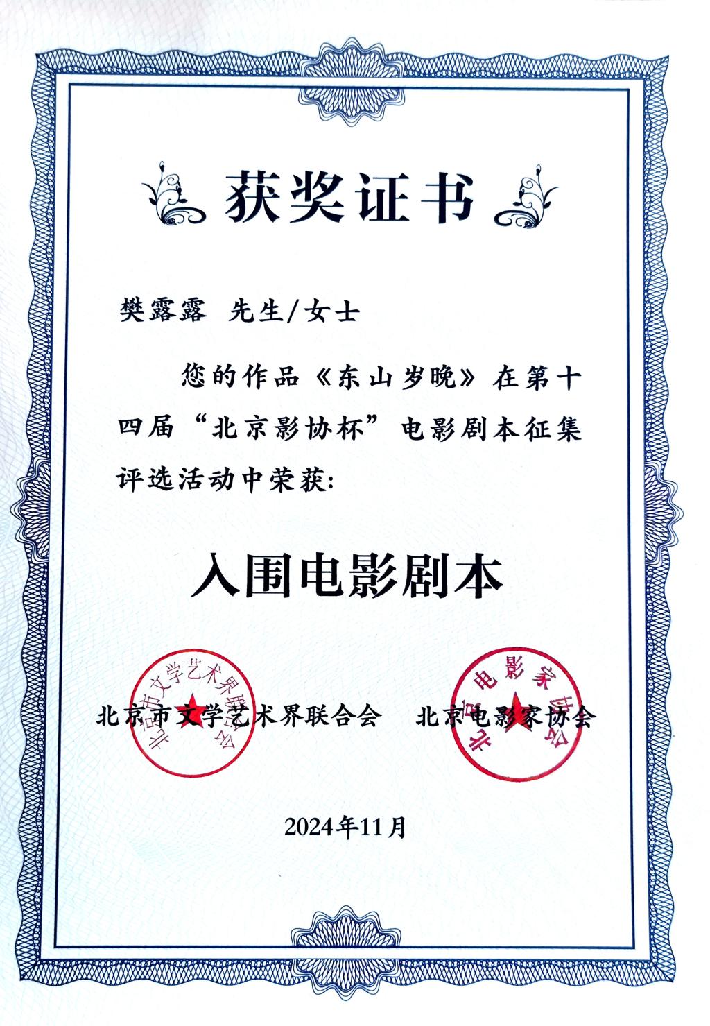 (通讯员 彭超)11月30日,第十四届“北京影协杯”电影剧本征集评选活动表彰仪式暨优秀剧本推介会在北京市文联艺术工坊成功举行。我院教师樊露露的历史题材电影剧本《东山岁晚》荣获“入围电影剧本”奖。北京市文联党组成员、副主席董昕,北京市委宣传部影视处处长韩培,北京影协副主席、“北京影协杯”评委会主任、编剧张冀,北京电影学院文学系主任、教授黄丹,中央戏剧学院电影电视系党总支书记、教授武亚军,电影频道电影创作部主任林丽宁等出席活动并为受表彰者颁发证书。