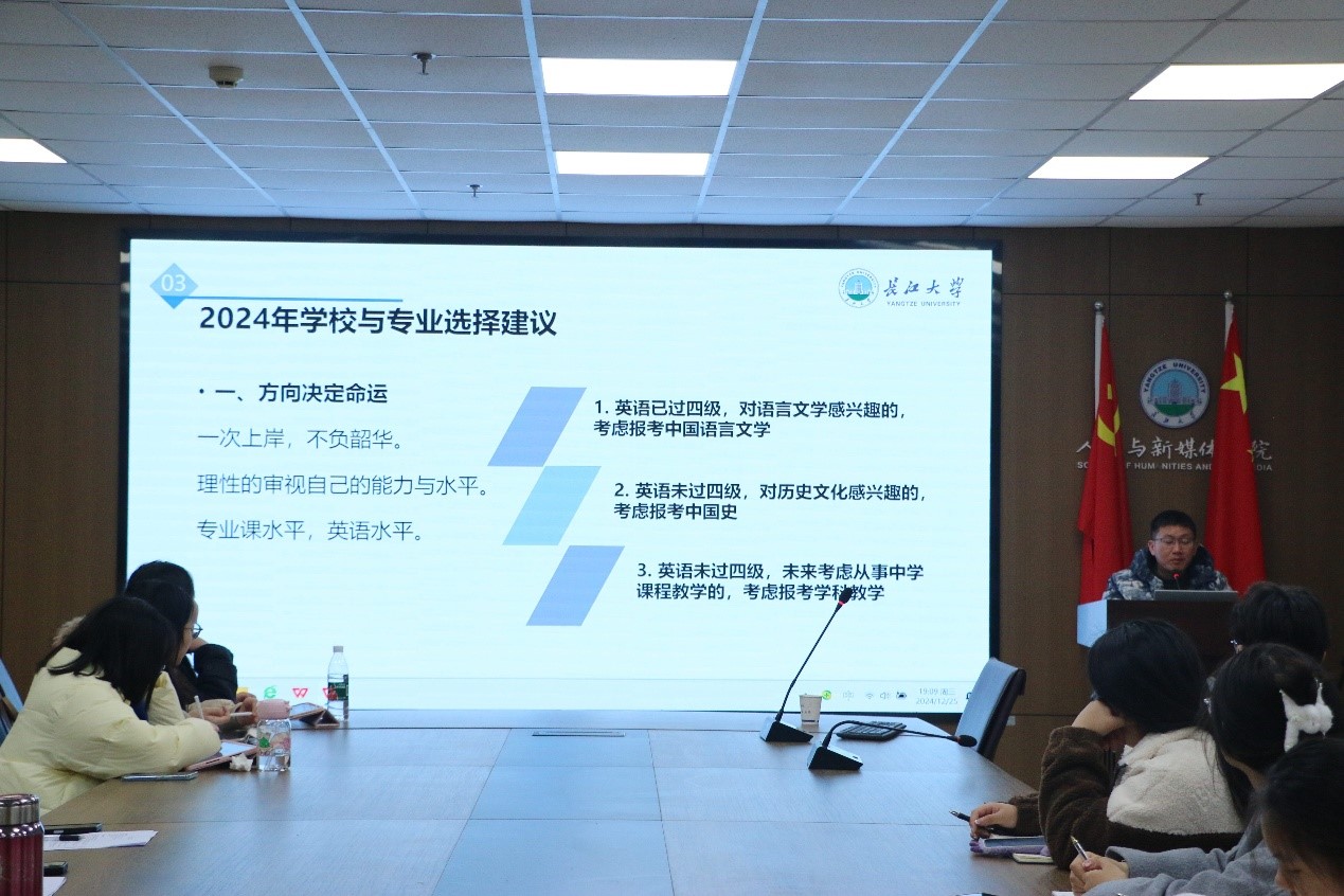 李院长结合2024年考研分数线情况,从学校和专业选择两方面给学生做了规划,并提出“多咨询,多请教,切记盲目选择;夯实基础,钻研学术;笨鸟先飞,广结善缘”的建议。