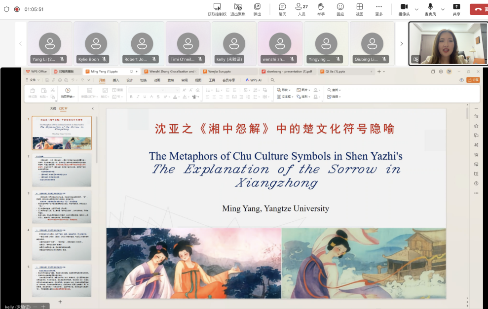 我院杨名教授参加了本次会议,并针对会议主题之一“Nostalhia:Lost Past or Lost Future(怀旧:失落的历史还是失落的未来)”做了题为“The Metaphors of Chu Culture Symbols in Shen Yazhi'sThe Explanation of the Sorrow in Xiangzhong(沈亚之《湘中怨解》中的楚文化符号隐喻)”的30分钟线上直播主题发言。发言中认为,唐代文人沈亚之《湘中怨解》中的楚文化符号包含了多层隐喻:楚辞、楚歌、楚舞的使用以及“湘中”地点的选择都隐喻了沈亚之的“士不遇”之悲;郑生与湘中女神汜人的分离则隐喻了沈亚之永远失去爱妾卢金兰的悲伤;文中以湘中风涛凄迷为结局,隐喻了沈亚之对人生虚无迷茫的体悟,具有深沉的幻灭感。《湘中怨解》中楚文化符号的使用,体现了唐人对楚文化精神的广泛认同,对楚文化艺术的当代发展也有深刻的启示。发言结束之后,多位学者针对楚文化艺术的国际影响力进行了深度的讨论和交流。
