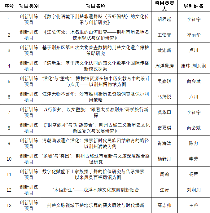 经专家评审,拟将《数字化语境下荆楚非遗舞蹈〈五虾闹鲇〉的文化传承与创新研究》等13个项目推荐为校级项目。